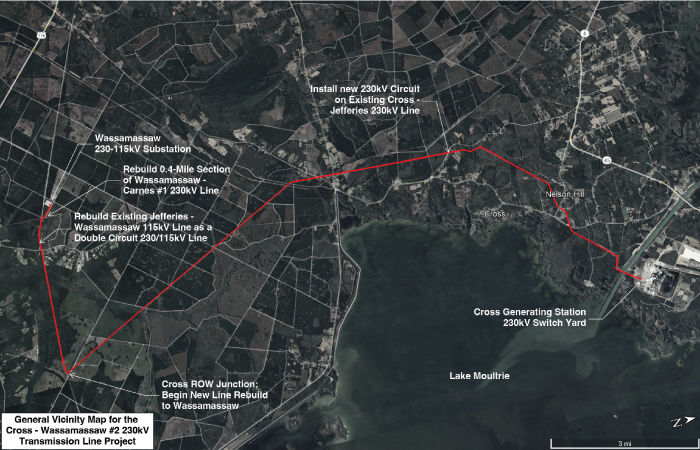 Santee Cooper is constructing a new 230 kV circuit on existing right of way from the Cross area to the Wassamassaw area in Berkeley County, South Carolina. This project will provide additional transmission capacity to support the load growth, and it will also provide increased electric reliability to residents and businesses throughout South Carolina. Construction will involve removing and rebuilding approximately 3.7 miles of existing transmission line and installing new wire on 15 miles of existing line structures. The new transmission line will be constructed to the most up-to-date standards and codes that will provide more resilient to adverse weather conditions.