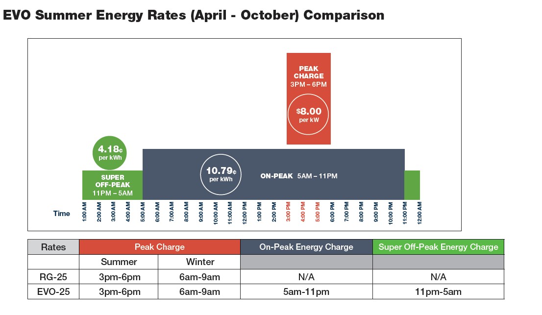 You can see time periods and energy charges for the EVO rider below. The monthly Customer Charge is $5.00; this is in addition to your existing customer charge. Electric usage for the remainder of the home will continue to be billed under the RG or RT rate. Charges may apply if a customer terminates service under this rider after fewer than two years.